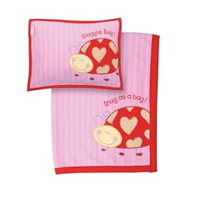 Your little lady will love this adorable "Ladybug" Blanket & Pillow Set. Smiling Ladybug on a pink striped background with red trim. Pillow reads: "Snuggle Bug" and blanket reads: "Snug As A Bug". Perfect for naptime! Not only is this blanket & pillow set adorable, it's made from the best quality fleece fabric and features removable pillow covers for easy care. Set includes one blanket and pillow, folded and tied together with a red bow.